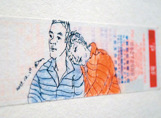 江昭彥拿發票素描,幫參觀民眾畫肖像。