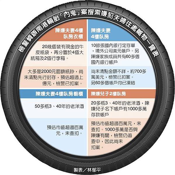 此外,陳嫌夫妻利用父母、胞妹、兩名兒子等親屬開立十多家銀行、六十多個帳戶「藏錢」,上月已將兩人境管及凍結國內外帳戶。