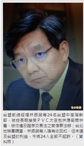 台塑前總經理林振榮等24名台塑中高階幹部,被控長期接受PVC太空包供應廠商供養,被依違反證券交易法之背信罪法辦;台北地檢署調查,林振榮等人確有收回扣,但未損及台塑的利益,今將24人全部不起訴。(資料照)