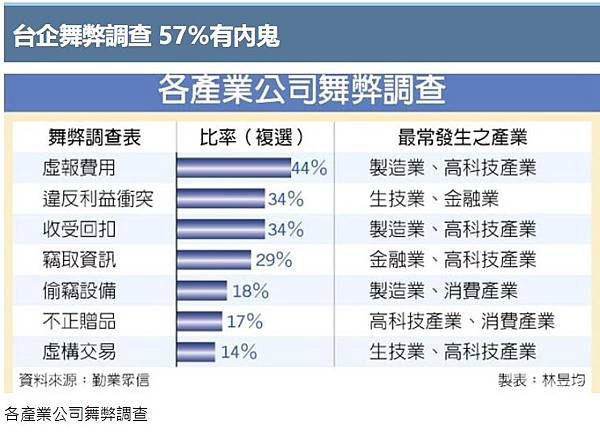 以各產業別分析,曾韵表示,虛報費用與收受回扣,以製造業與高科技、媒體及電信業虛報費用最嚴重,而竊取機密資訊或個資在金融服務業最常見,至於違反利益衝突多數則發生在生技醫療業。