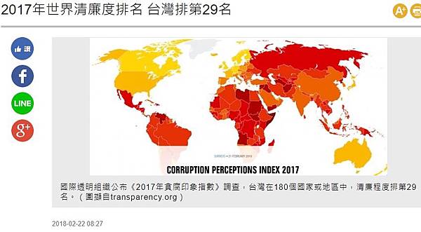 分享2017年世界清廉度排名 台灣排第29名到Facebook 分享2017年世界清廉度排名 台灣排第29名到Line 分享2017年世界清廉度排名 台灣排第29名到Google+