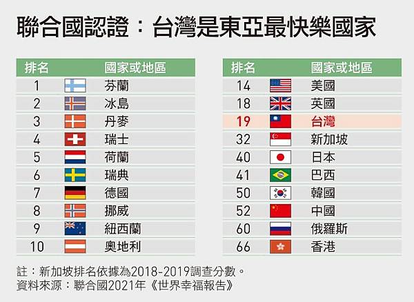今年3月,聯合國永續發展解決方案網絡(SDSN)發表的《世界幸福報告》(World Happiness Report),這是聯合國少數有納入台灣的評比。芬蘭連續四年居冠,台灣名列第19名,三年總和則排第24,是東亞最幸福的國家。