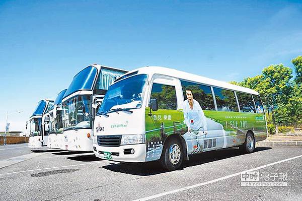 池上環鄉公車上路,車體上貼著金城武的照片。(圖/台東縣府提供)