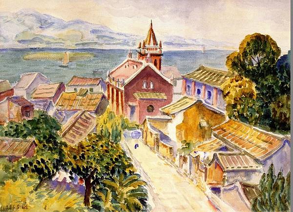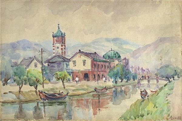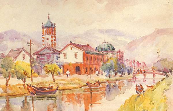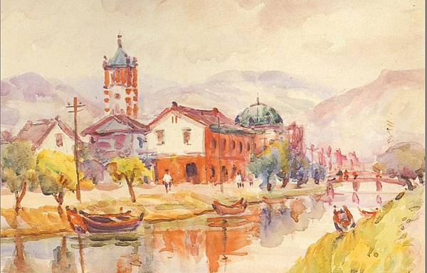 此作除建築外,色彩清淺,十分淡雅。而郵局建築主體透視分面清晰條理,水面倒影,依岸上景物色調變化,表現十分逼真。