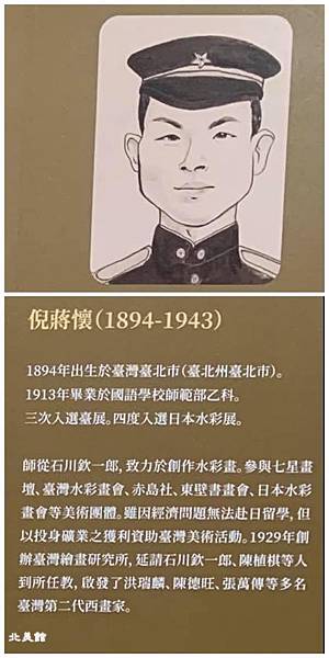 倪蔣懷(1894-1943)為台籍第一代西畫家,就讀台北師範學校時期,受教於石川欽一郎(1871-1945),並在石川先生建議下,致力台灣美術的推廣及贊助活動。