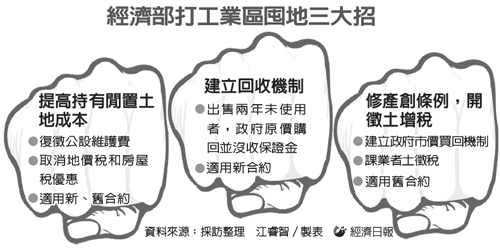 為抑制工業區囤地,經濟部將建立收回機制,對於工業土地出售案,新合約全部加上附買回條款。至於過去二、三十年早已賣斷土地舊案,若業者閒置,經濟部將祭出產創條例,未來除可買回,也將課業者土地增值稅;透過此機制,經部將可約束工業區業者土地利用。
