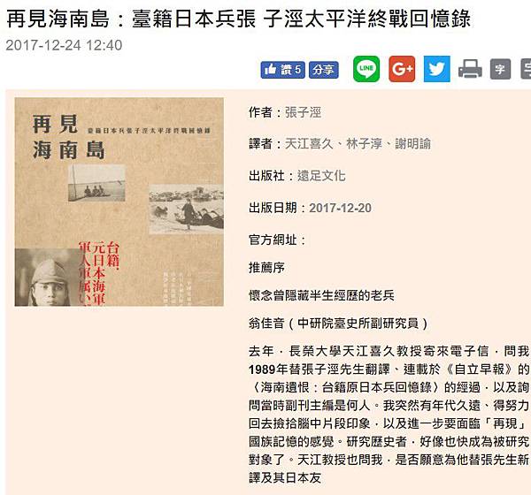 - 李展平等,《烽火歲月——臺灣人的戰爭經驗》,南投,國史館臺灣文獻館,2005。