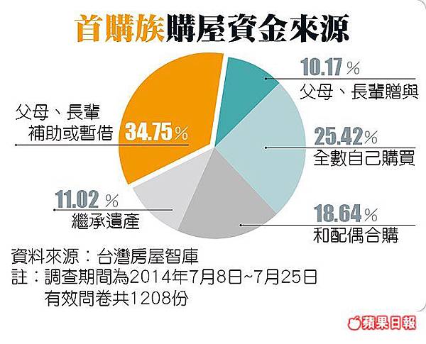 靠父母幫忙者中,包括父母、長輩補助或暫借,占34.75%、繼承遺產或祖產占11.02%,由父母、長輩贈與或全額購屋價款占10.17%,而父母協助的金額占總價的比例平均為19.41%。
