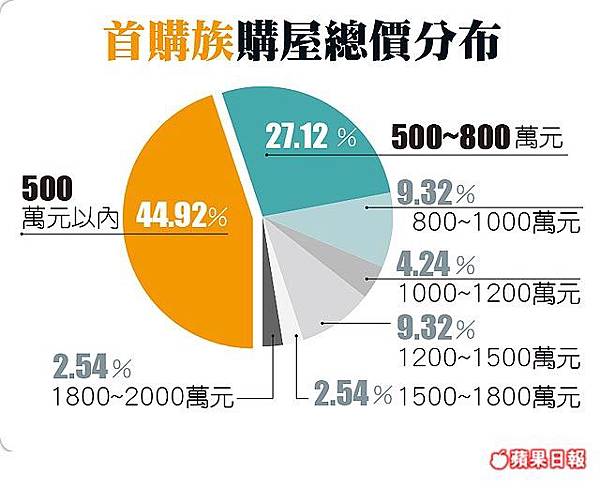 至於首購族群的購買總價帶,仍以總價500萬元以內居多,約佔4.5成,但雙北地區首購,仍以總價500~800萬元為主。