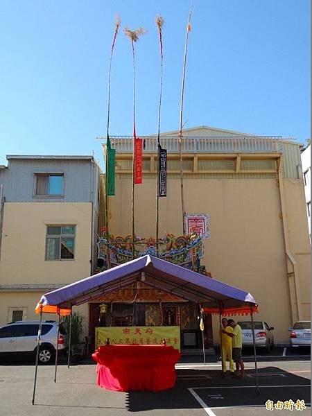 南市東區南天府農曆七月辦法會豎起三支燈篙(掛黑、紅、綠布)號召四方好兄弟參與。(記者王俊忠攝)