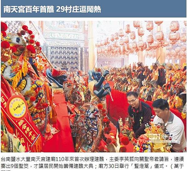 台南鹽水大豐南天宮建廟110年來首次辦理建醮,主委李英哲向關聖帝君請旨,連續擲出9個聖筊,才讓居民開始籌備建醮大典;廟方30日舉行「豎燈篙」儀式,31日展開為期7天的建醮大典。
