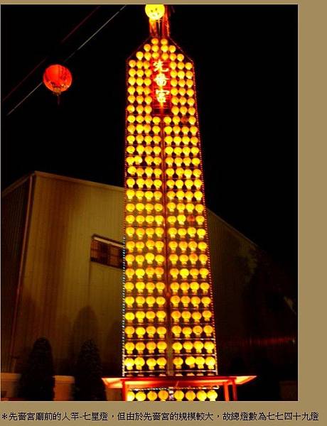 *先嗇宮廟前的人竿-七星燈,但由於先嗇宮的規模較大,故總燈數為七七四十九燈