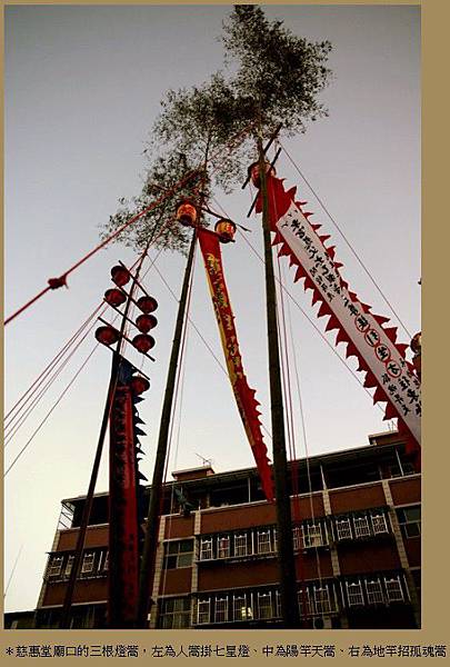 *慈惠堂廟口的三根燈篙,左為人篙掛七星燈、中為陽竿天篙、右為地竿招孤魂篙