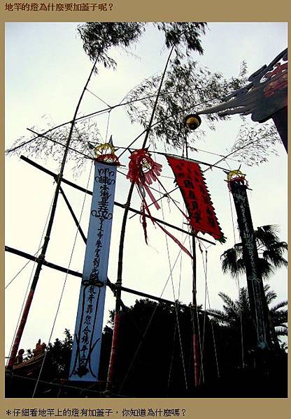 燈篙是用青竹去竹頭留尾約12~15公尺高,建醮祭儀時可以看到。