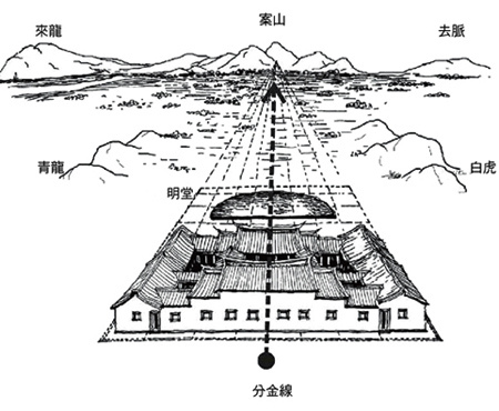 林安泰古厝1986年自四維路拆遷重組于濱江公園,即脫離原有的地理風水環境,昔日古厝分金線正前方原以蟾蜍山巒頭作為『風水案山』,是完整的傳統民居風水地景,前有案山,左右有青龍、白虎護砂圍蔽,半月水池前為平坦的藏風聚氣「明堂」,今日閩式庭園為再現古厝的風水地景,於正前方形塑象徵案山巒頭的假山「顧渚茗山」,明堂左右以微凸草坡包被中央明堂腹地,以之重現彌補古厝的風水地景象徵。