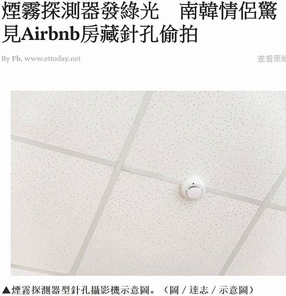 據南韓《先驅報》報導,南韓一對情侶日前透過網路租房網站Airbnb入住日本一家民宿,他們晚上躺在床上準備就寢時,突然發現天花板角落的煙霧探測器亮著一點綠燈,且正對著床的位置,當時還開玩笑稱,或許是個偷拍鏡頭。兩人之後覺得有點不對勁,便上網查資料,竟搜尋出網上有販賣一款一模一樣的煙霧探測器型偷拍鏡頭。