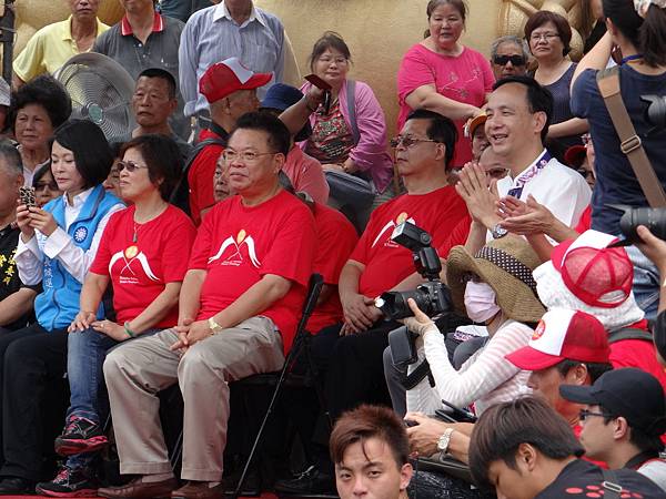 新北市長朱立倫也前往參拜義民爺,並參與義民祭開幕活動,看到來自新北市的義民廟,還特別從觀禮台下場問候、合照,展現親和力。(魯鋼駿攝)