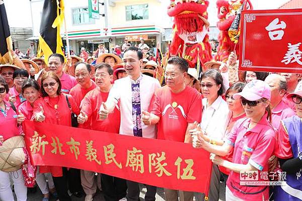 新北市長朱立倫上午先到義民廟參拜,接著參與義民祭開幕活動,他致詞時更以客家話向大家問候,開幕活動有來自各地義民分香廟的踩街表演,朱立倫看到來自新北市的義民廟,還特別從觀禮台下場問候、合照,展現親和力。