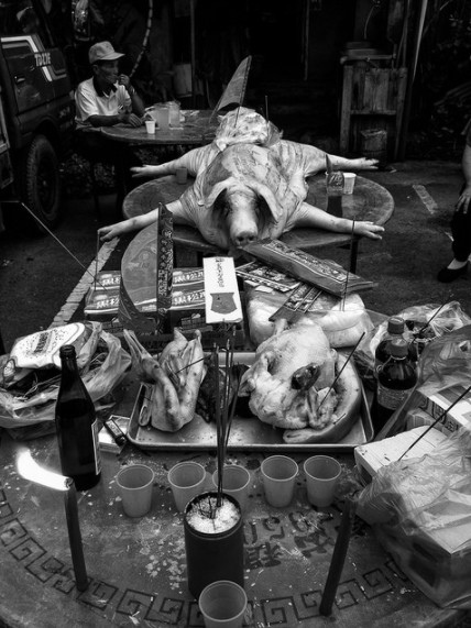 七月做普度,皆與土著略同,惟祭用豬羊,較土著為常。凡村社祈安建醮,先期禁屠宰,齋戒備極虔誠,延僧道建道場,或二朝、三朝,間或有五朝者。閩莊皆茹素連日,祭品亦皆用素。至尾日普度,大開屠宰,各首事及各村莊多出全副豬羊,豬以極大為尚,間有豬一頭重五百餘觔至六百觔者,羊以角長而正為尚,間有角長一尺一、二寸至一尺三、四寸者,皆數年前預蓄於家,極意飼養以備臨時應用。