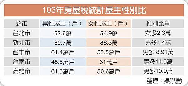 財政部公布今年房屋稅申報的納稅人性別統計,全台申報總人數為965.9萬戶,持有總面積約13.6萬公頃。觀察其他縣市,普遍是男性屋主多於女性,其中四都中又以台南市最明顯,男性納稅人戶數達到45.5萬戶;女性僅有31萬戶,差異多達14.5萬戶。