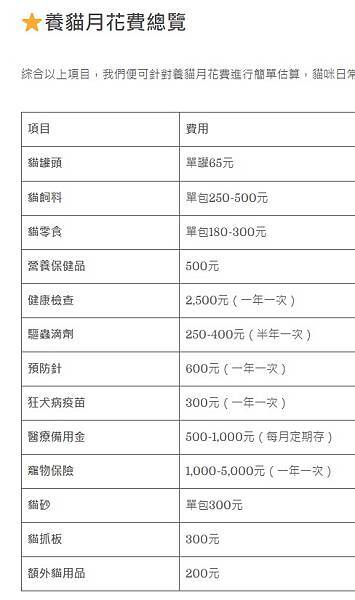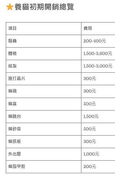 養貓支出,初次費用;加總後我們可以知道,初次養貓需花費7,800-10,600元不等的費用。