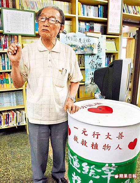 創世員工須設功德桶(圖中鐵桶)自行補足獎金來源。圖為創世、華山、人安創辦人曹慶。吳貞慧攝