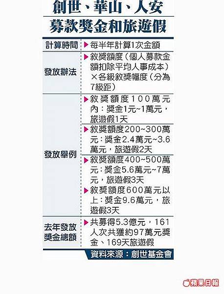 去年創世、華山、人安扣除政府補助,共募集約十點九億元,其中員工募集約五點三億元,結算後一百六十一人次獲獎,共發出九十七萬餘元獎金及一百六十九天假。有人去年募集一千一百萬元,領到最高十萬零八百元獎金,以該會平均月薪三萬到四萬元計算,相當加發近三個月獎金。