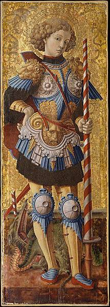 聖喬治(Saint George),傳說出生在公元260年前後,巴勒斯坦人,後來成為一名羅馬騎兵軍官。他驍勇善戰,屢戰屢勝,屢建奇功。公元303年,在一次阻止基督徒受迫害時被殺,年僅四十三歲。到了公元494年,為教皇格拉修一世(Gelasius)封聖。