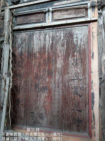 關帝詩竹畫是清康熙55年(公元1716年)韓宰臨摹的一首五言詩:“不謝東君意,丹青獨立名;莫嫌孤葉淡,終久不凋零。”畫的右上端還有兩方刻印,上邊是陰文“關羽之印”,下方為陽刻“漢壽亭侯”。 @ 姜朝鳳宗族 :: 痞客邦 PIXNET :: - http://goo.gl/VIoUxu