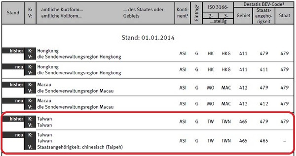 不過根據一份由德國聯邦統計局的文件顯示,自2014年1月1日起,台灣的國家(Staat)一欄從479(中華人民共和國)便成了「無」,但是地域(Gebiet)與國籍(Staatsangehörigkeit)仍維持465(台灣),記者訪問到一名德國留學生,她表示如果在學校以手寫的方式填表格,在國籍一欄上一定可以寫台灣;但若是以網頁填表,官方選項上沒有台灣選項的話,就只能勾選中國了,「不過我的簽證與居留證上國籍一欄仍寫『台灣』」。
