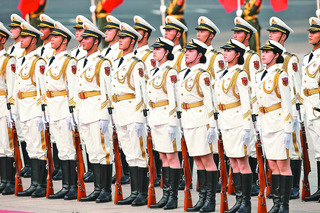 烏茲別克總統卡里莫夫十九日訪問北京,大陸國家主席習近平在人民大會堂前以軍禮歡迎。這也是中共解放軍儀隊(大陸稱「儀仗隊」)換裝新式制服後首度亮相,此外從五月開始加入儀隊的女兵,仍然是吸引觀眾的焦點。
