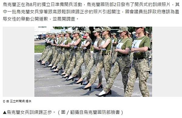 烏克蘭正在為8月的獨立日準備閱兵活動,烏克蘭國防部2日發布了閱兵式的訓練照片,其中一批烏克蘭女兵穿著跟高跟鞋訓練踢正步的照片引起關注,國會議員批評政府應該為羞辱女性的舉動公開道歉,並展開調查。