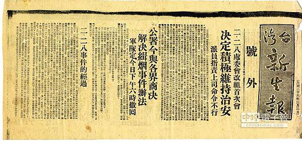 1947年228事件爆發後,隔月初由各地民意代表成立的「228事件處理委員會」,調查緝煙血案,協調官民對立,隨後更提出《32條處理大綱》,作為建議當局的政治改革主張。當時多家報紙以「號外」報導,刊載228處委會的相關作為。台北228紀念館周末起3天將首度展出「號外」報紙第一手史料。