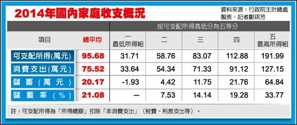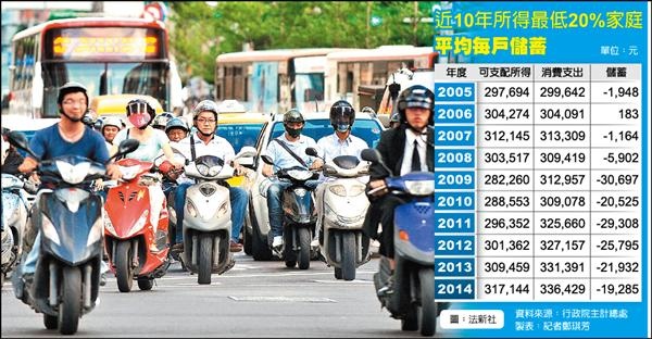 舉例來說,當出現「負儲蓄」現象時,家戶就得拿出過往儲蓄、或是舉債,來支應生活所需。依主計總處統計,馬政府執政七年來(二○○八到二○一四年),所得最低廿%家庭平均每戶累積「負儲蓄」已達十五.三四萬元。(記者高嘉和)