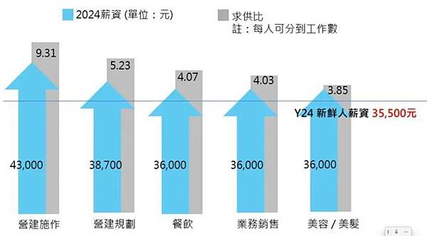 各行各業薪資當然也有差異,根據數據來看,其中住宿及餐飲業經常性的薪資3到4萬元、製造業落在4到5萬元,而相對較高的包括出版影音及資通訊業達到6萬多元,金融及保險業則是7萬多元。