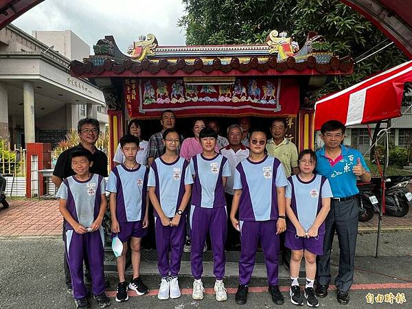 農曆八月十五日土地公聖誕,東山國小學童製作麻糬,前往校門旁的土地公廟祝壽,傳承百年信仰與米食文化。(記者王涵平攝)