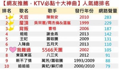 〔本報訊〕對於時下年輕人而言,跟三五好友去KTV唱歌早已成為不可或缺的休閒活動之一,那你知道哪些歌曲是去KTV必點必唱的嗎?網路溫度計整理出10首去KTV必點的十大歌曲,馬來西亞哥手陳勢安的《天后》力壓經典對唱情歌《屋頂》和被「超級星光大道」節目唱紅的《背叛》,勇奪第一。