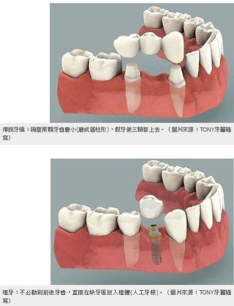 植牙是缺牙時的治療選擇之一,李正喆解釋,植牙手術是在缺牙的部位,先將人工植體(俗稱人工牙根)打入骨骼,穩定之後在植體上方套上假牙,也就是「牙冠」,若相連部位的牙齒都缺了,視情況可以不用在每個部位都打上植體,可間隔種植,上面再將假牙做連結像橋一樣,稱作「牙橋」。