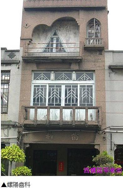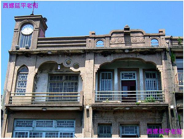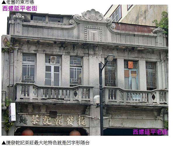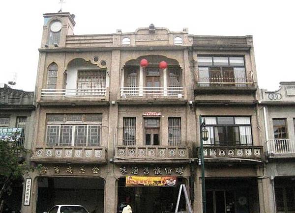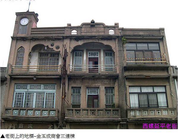 西螺地標「鐘樓」所在之三連棟金玉成商會、凹字形陽台的許捷發茶行等等。