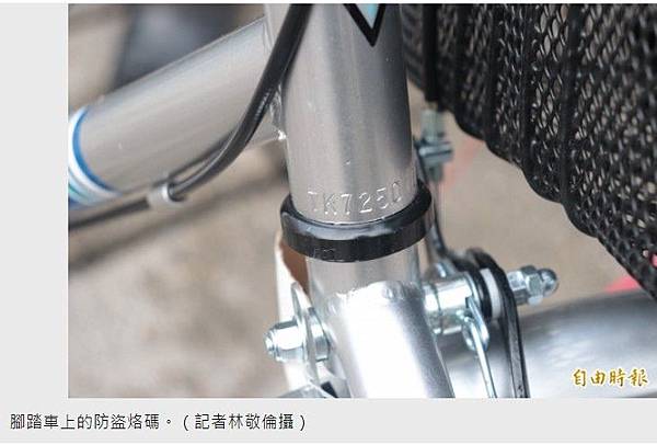 腳踏車上的防盜烙碼。(記者林敬倫攝)