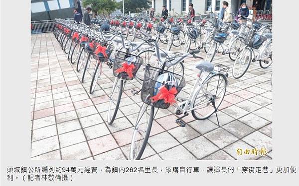 〔記者林敬倫/宜蘭報導〕宜蘭縣頭城鎮公所編列約94萬元經費,為鎮內262名鄰長添購自行車,讓鄰長們「穿街走巷」更加便利,協助公所傳達政令或服務街坊;另外,鎮公所也開放每名鄰長每個月可向公所申請500元為鄰長事務費,1年可申請6000元,盼能補貼鄰長服務民眾的辛苦。