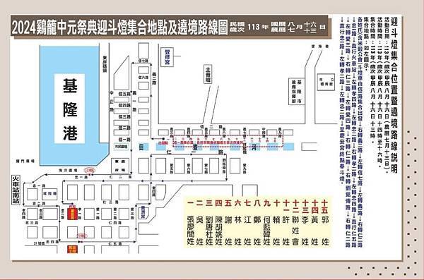 下午基隆下起大雨,幸好遊行開始後雨勢已停,今年參加的遊行隊伍共有32個單位,由15個各姓宗親會及機關團體組成,市長林右昌致詞後,由警方重機打頭陣,緊接著輪值主普的江姓宗親會率先登場,帶領其他宗親會的藝閣、花車浩浩蕩蕩出發。