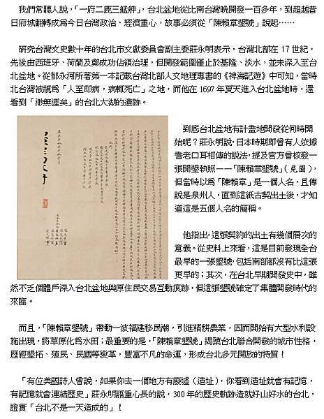 清朝時才有大規模的漢人開墾臺北地區,而其中現存最早的墾照紀錄即康熙48年(1709年)陳賴章墾戶請墾「東至雷匣秀朗、西至八里分干脰外、南至興直山腳下、北至大浪泵溝」幾乎涵蓋臺北盆地大半,但是這種墾照,多是墾戶向官方取得大片地區開墾權,再分佃給其他漢人。以下有一張康熙48年陳賴章、陳國號、戴天樞三墾號合約可證明此事。