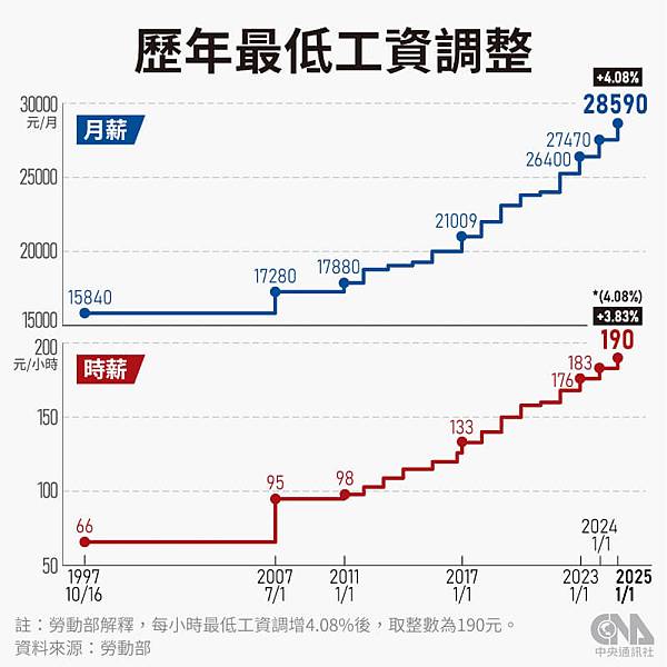 最低工資連9漲調幅4.08% 月薪2萬8590元時薪190元 | 生活 | 中央社 CNA