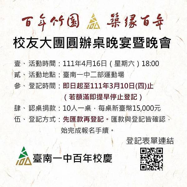 南一中校友總會說,校友和貴賓認桌捐款方式,請先匯款後再上網登記,待匯款與登記皆確認,始完成報名手續。匯款戶名:「中華民國國立臺南第一高級中學校友總會」,屆時將由校友總會開立捐款收據。活動登記至3月10日截止,若提早額滿即停止登記。詳細辦法可至https://reurl.cc/jklZ61查詢,或電洽校友總會秘書林小姐0975-586693。