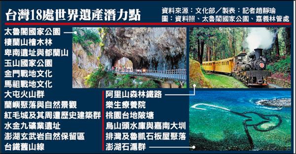 從2002年開始,台灣文化部門陸續評出18處世界遺産潜力點。其中,物質文化遺産包括玉山、太魯閣、栖蘭山檜木林、澎湖玄武岩自然保留區、阿里山森林鐵路等,非物質文化遺産則有泰雅族神話傳説、布袋戲、歌仔戲、阿美族豐年祭、媽祖信仰等。