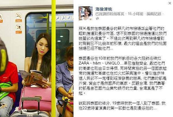 海倫清桃在臉書分享泰國所見,「想不到泰國的機場捷運比我們晚蓋卻先通車」,但也表示「看似進步神速,人民卻不一定嚐到經濟發展的甜果,他們靠的都是外資,資金才是無國界的贏家。反觀台灣,我們靠著的都是自己國內企業和銀行的力量,台灣真是了不起。」