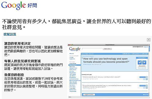 Google好問可以說是wed2.0的實現,它並不是單純的YES或No,還可以透過人與人的互動與發表內容,找到社群中最有共識的想法、意見,並且透過投票功能,可以知道有什麼項目是被贊成、有什麼項目是被反對,透過Google好問就可以輕易地進行討論並且了解社群的想法。