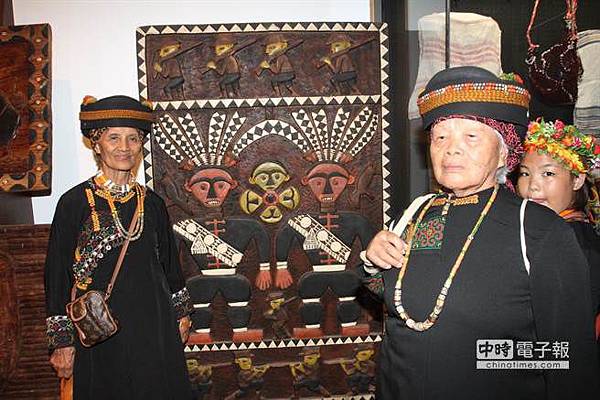 屏東排灣族原住民朋友特地在現場老祖宗木雕作品前,展現自己的文化認同感。(林文煌攝)