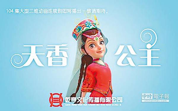 外媒《華盛頓郵報》報導,由深圳一家動畫公司斥資300萬美元策畫的3D電影《天香公主》,將以長達104集的「動畫連續劇」形式於明年播出,且有國語和維吾爾語2種版本。